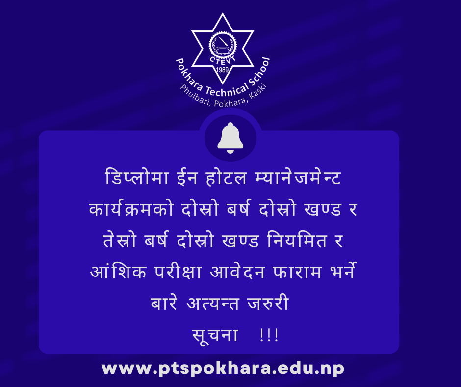 डिप्लोमा ईन होटल म्यानेजमेन्ट कार्यक्रमको दोस्रो बर्ष दोस्रो खण्ड र तेस्रो बर्ष दोस्रो खण्ड नियमित र आंशिक परीक्षा आवेदन फाराम भर्ने बारे अत्यन्त जरुरी सूचना !!! Gallery डिप्लोमा ईन होटल म्यानेजमेन्ट कार्यक्रमको दोस्रो बर्ष दोस्रो खण्ड र तेस्रो बर्ष दोस्रो खण्ड नियमित र आंशिक परीक्षा आवेदन फाराम भर्ने बारे अत्यन्त जरुरी सूचना !!! NOTICE डिप्लोमा ईन होटल म्यानेजमेन्ट कार्यक्रमको दोस्रो बर्ष दोस्रो खण्ड र तेस्रो बर्ष दोस्रो खण्ड नियमित र आंशिक परीक्षा आवेदन फाराम भर्ने बारे अत्यन्त जरुरी सूचना !!! By Ptspokhara|2023-02-22T11:27:30+05:45February 22nd, 2023|NOTICE|0 Comments Read More