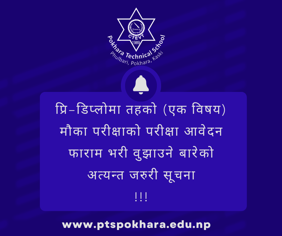 प्रि–डिप्लोमा तहको (एक विषय) मौका परीक्षाको परीक्षा आवेदन फाराम भरी वुझाउने बारेको अत्यन्त जरुरी सूचना !!! Gallery प्रि–डिप्लोमा तहको (एक विषय) मौका परीक्षाको परीक्षा आवेदन फाराम भरी वुझाउने बारेको अत्यन्त जरुरी सूचना !!! NOTICE प्रि–डिप्लोमा तहको (एक विषय) मौका परीक्षाको परीक्षा आवेदन फाराम भरी वुझाउने बारेको अत्यन्त जरुरी सूचना !!! By Ptspokhara|2023-02-10T11:18:56+05:45February 10th, 2023|NOTICE|0 Comments Read More